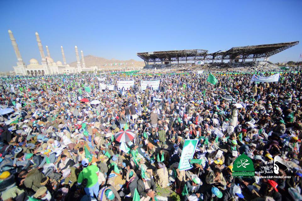 شارك قائد الثورة السيد عبد الملك بدر الدين الحوثي مع ملايين اليمنيين الذين توافدوا من جميع محافظات الجمهورية إلى العاصمة صنعاء للاحتفال بذكرى المولد النبوي الشريف الديني الذي أقيم في ميدان السبعين وسط وضع استثنائي تعيشه اليمن بما فيها العدوان والحصار الذي يفرضه تحالف العدوان على اليمن منذ قرابة ثلاثة اعوام .